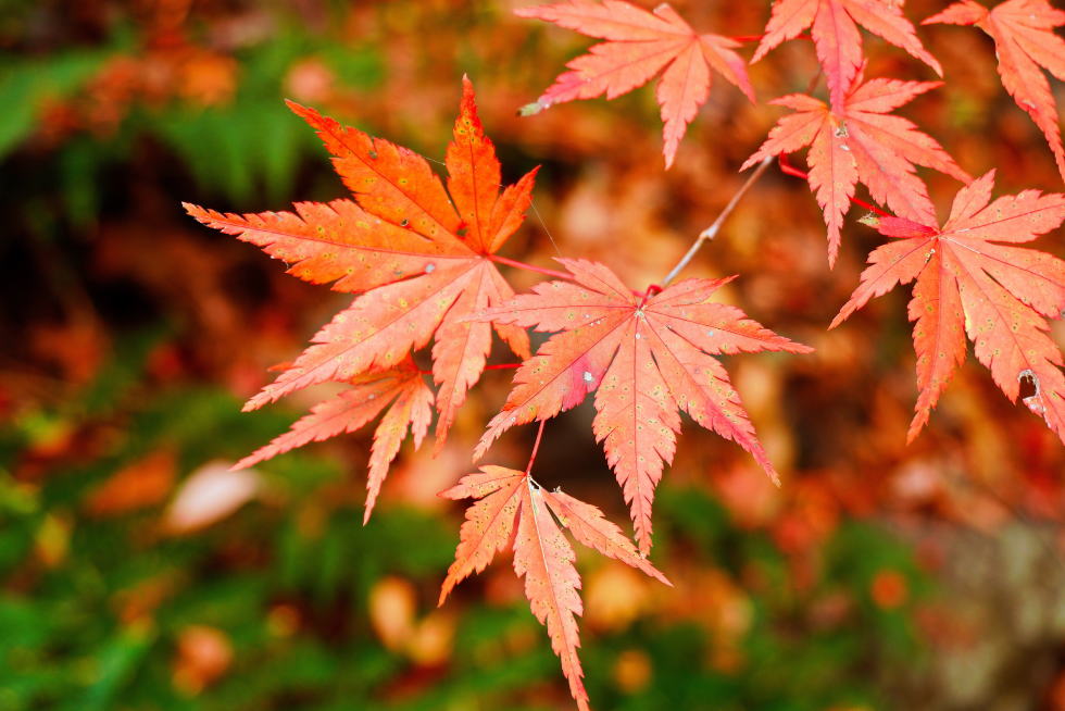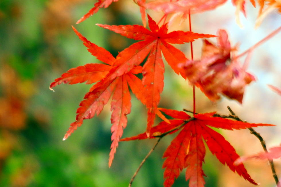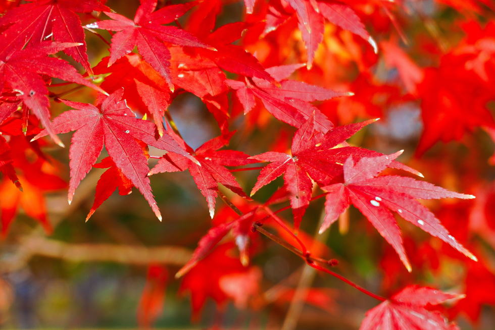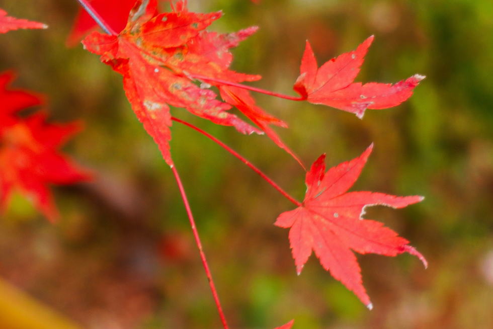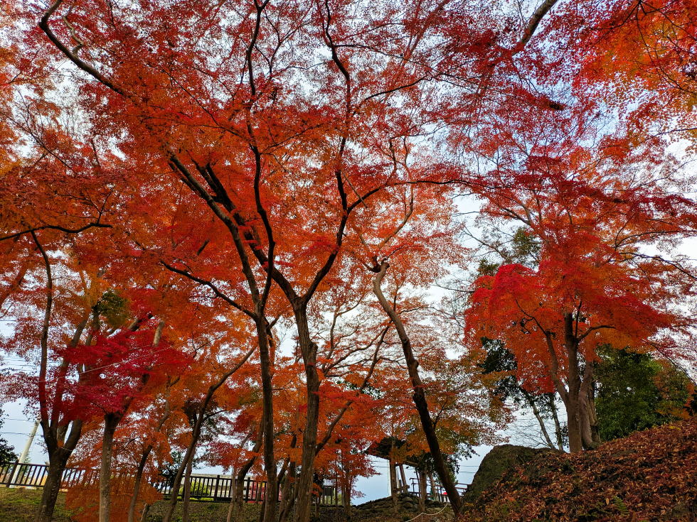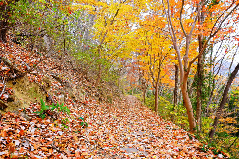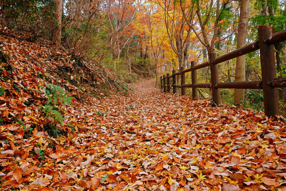 遊歩道 枯れ葉と モミジ とてもきれいです