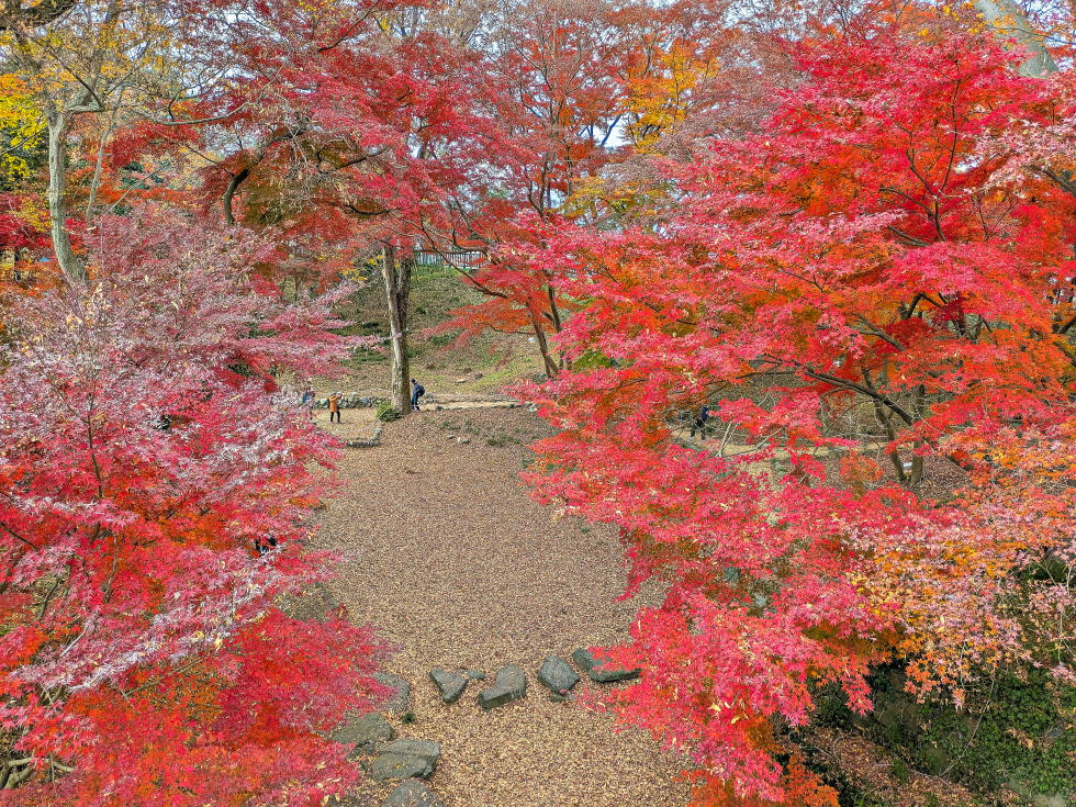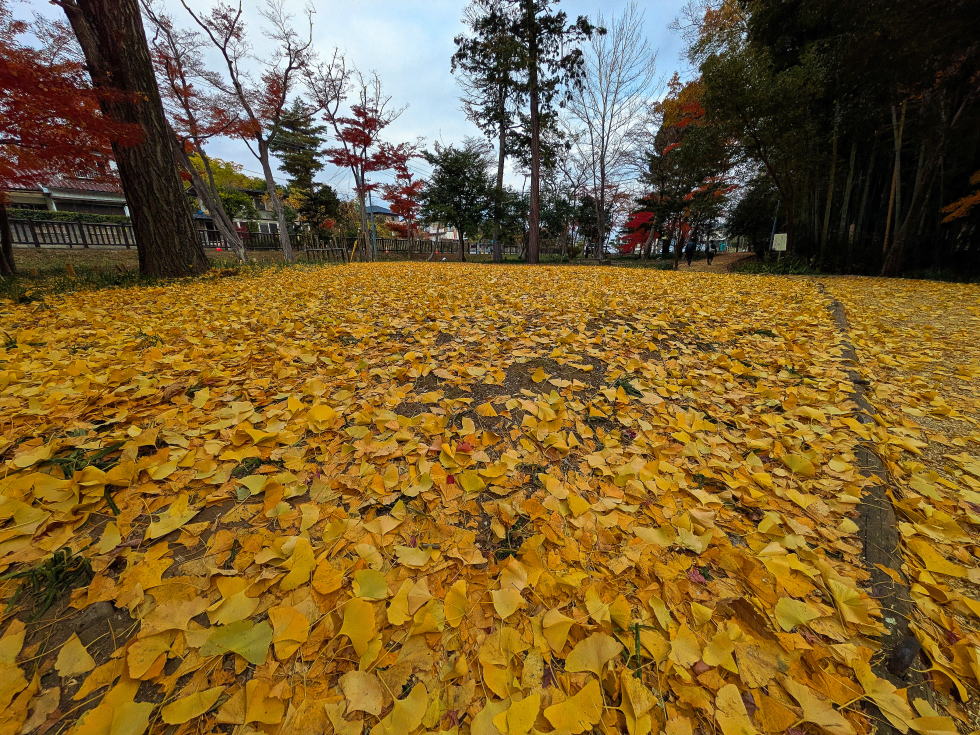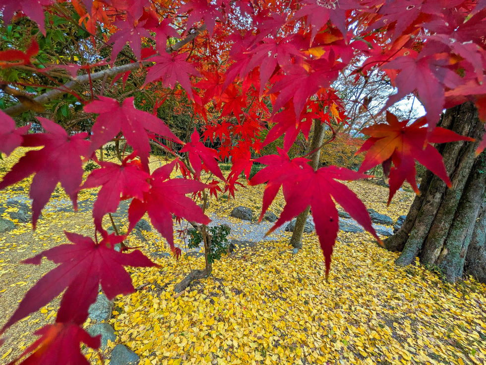銀杏の落ち葉が紅葉の赤色と程よくマッチしてます